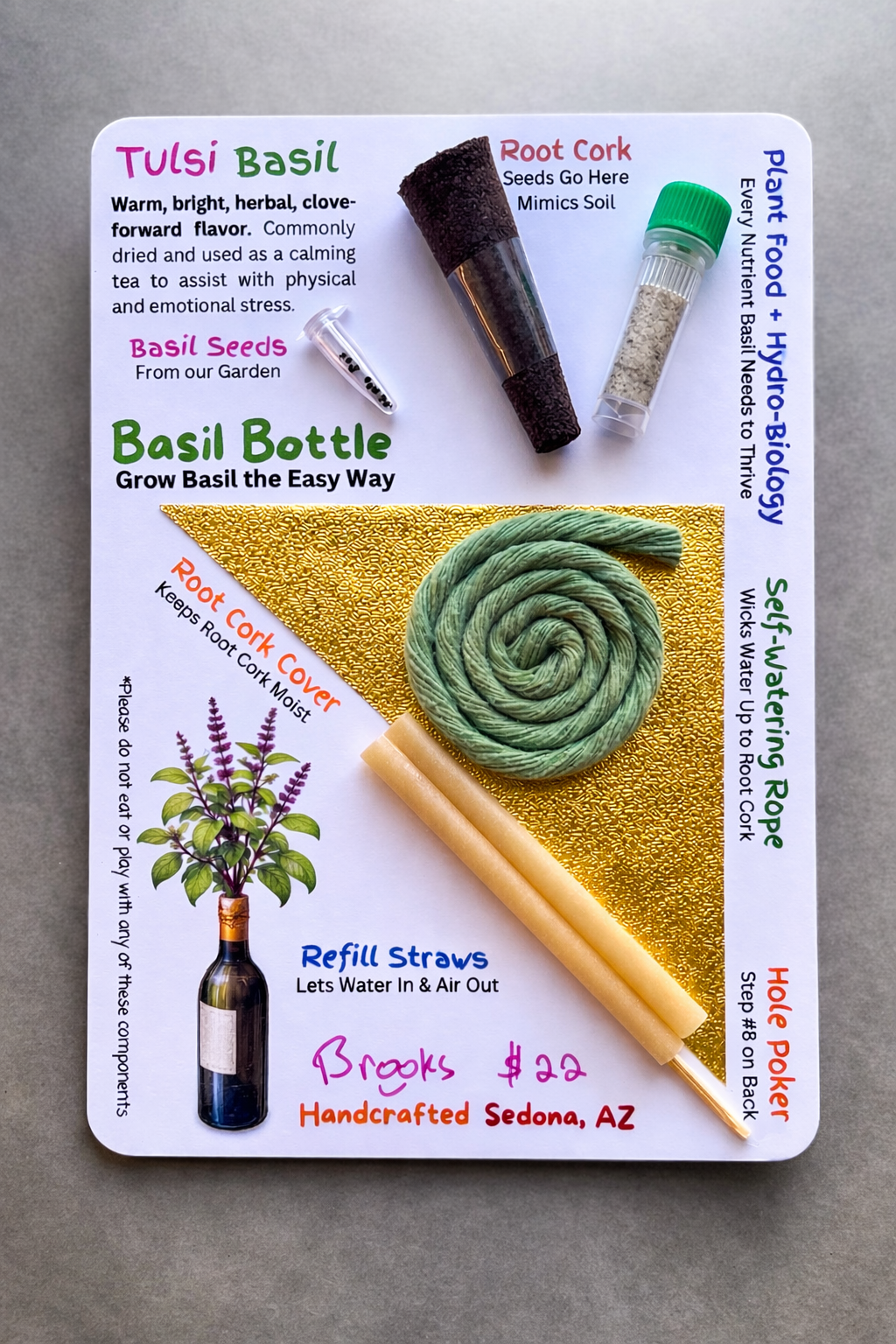 Fill any recycled beverage bottle (glass or plastic) with clean water, add the kit components, and set it in a sunny windowsill. As the water level drops, give it a quick refill with a squirt bottle and let your basil do the rest.